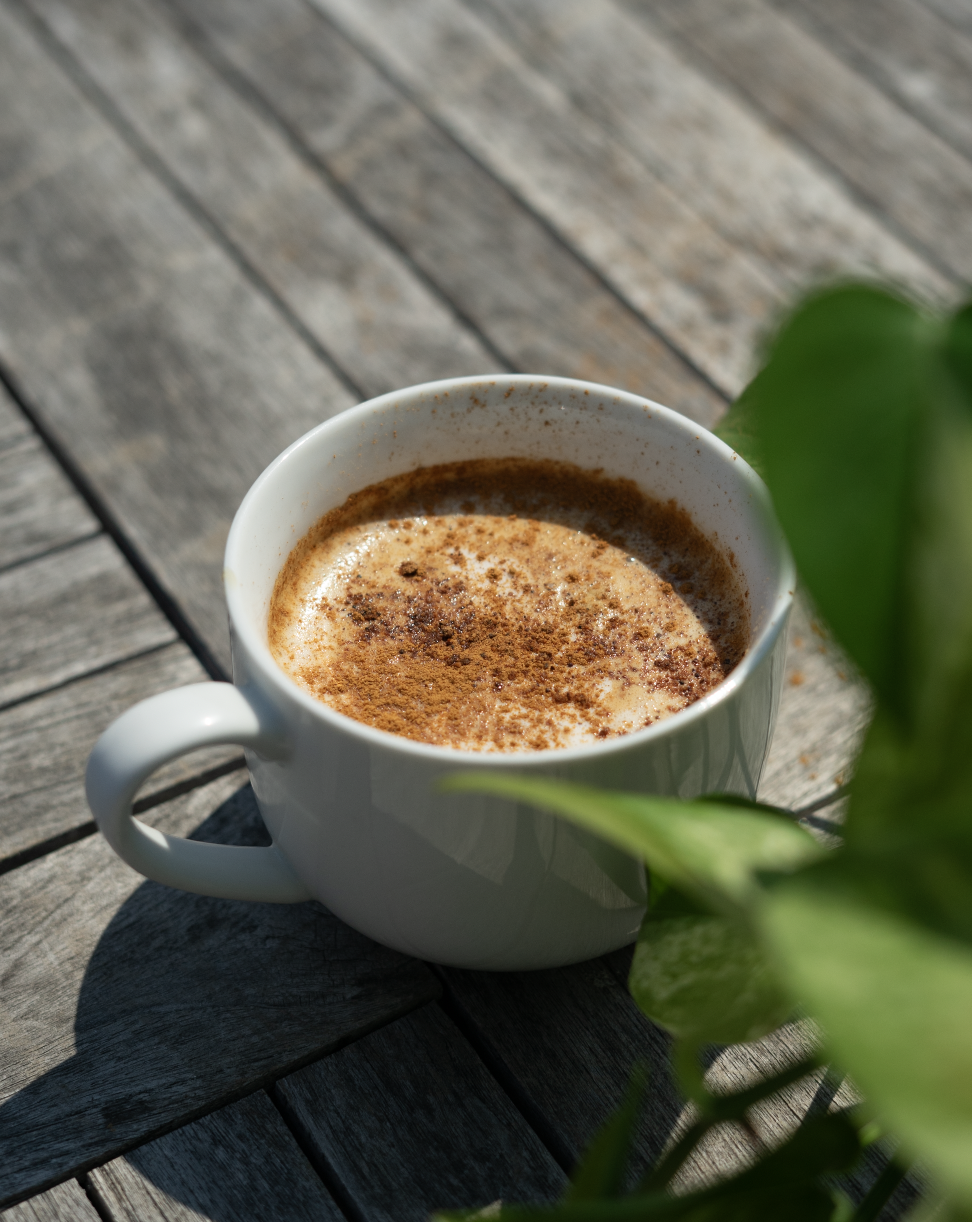 Cinnamon Bun Latte – Vanilla protein latte with maple, cinnamon & nutmeg. Choice of whey or vegan protein. — $6